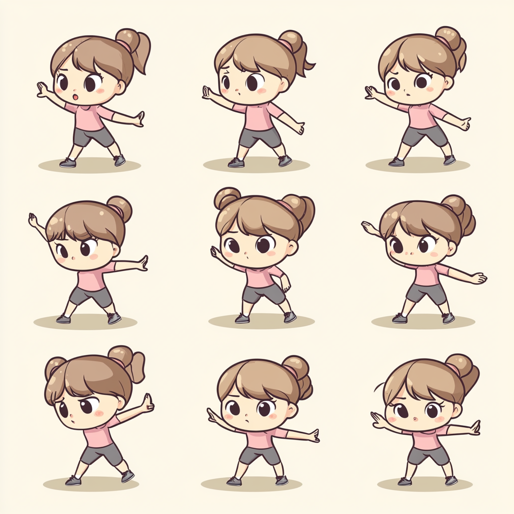 모든 동작은 8박자 리듬에 맞춰 진행되며, 특유의 행진곡 스타일 음악이 함께합니다.
